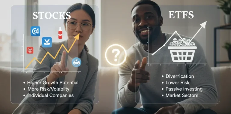 This guide breaks down how stocks and ETFs work, their benefits and risks, and how to decide which option fits your goals, risk tolerance, and investment style.